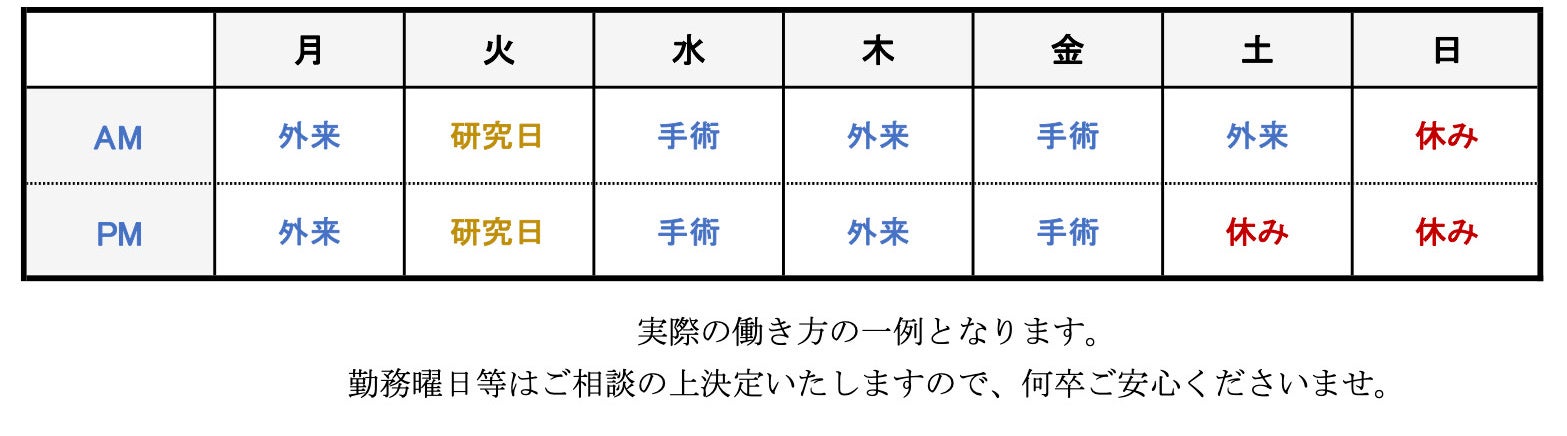 | 勤務時間 | ◆ 勤務時間 : 8:30~17:00 ◆ 勤務日数 : 4~5日/週 ◆ 研究日 : ご相談に応じます |