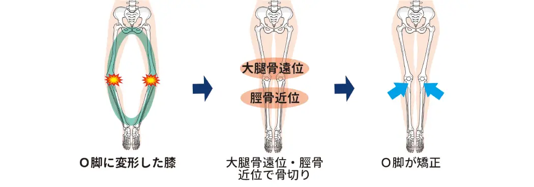 「膝周囲骨切り術」とは、膝関節をまたぐ大腿骨遠位(だいたいこつえんい)、または脛骨近位(けいこつきんい)、あるいはその両方で骨切りを行って膝関節を適正な位置に矯正し、正常な軟骨が残っている部分に体重がかかるようにする手術です。これによって、軟骨や半月板の摩耗が減って痛みが軽減されます。