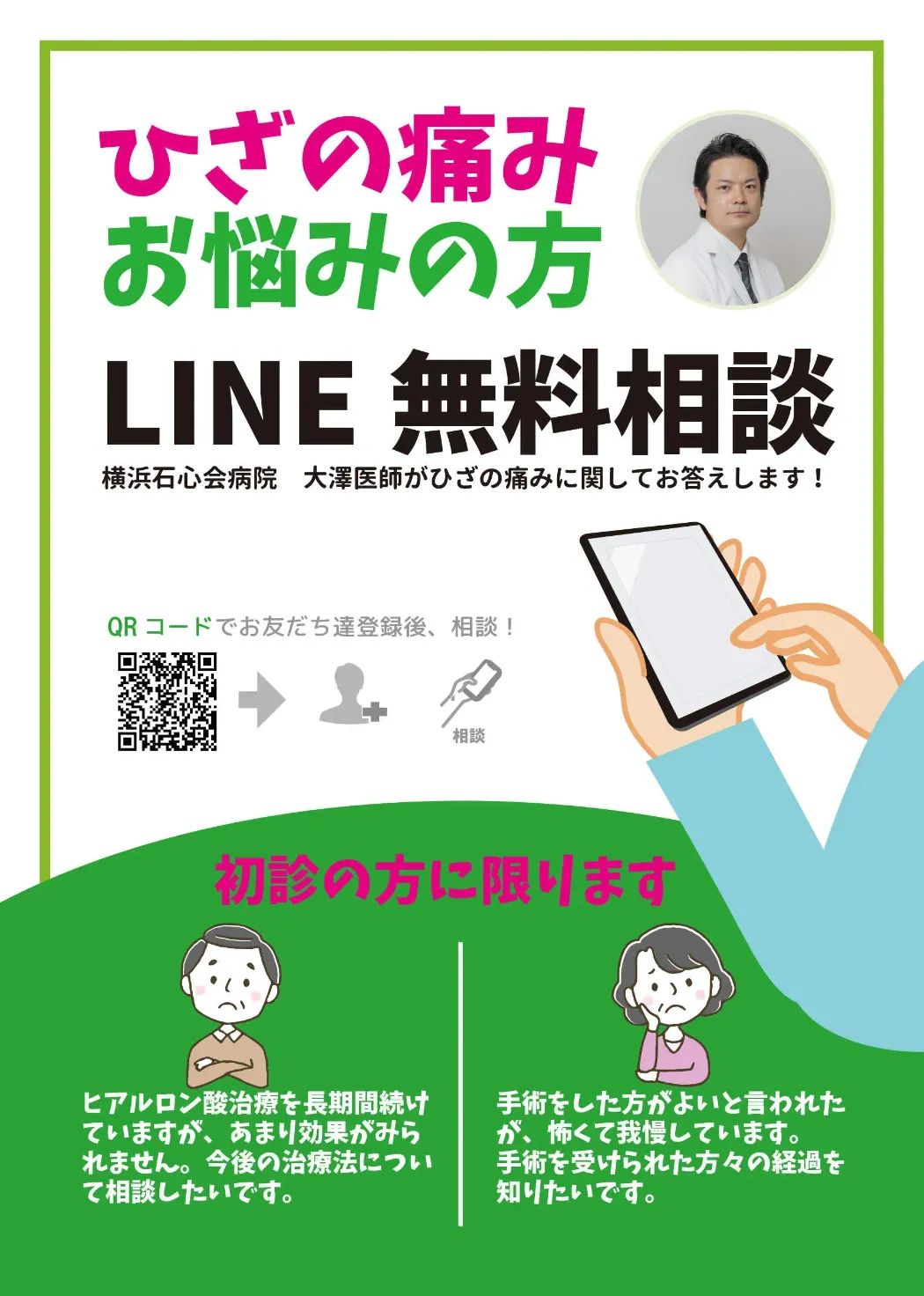 A.2021年4月より、LINEでの無料個別相談をお受けしております。(当院関節外科受診が初めての方のみ)