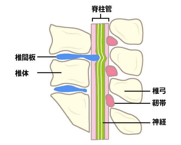 加齢によって椎間板からみずみずしさが失われてクッションとしての機能が果せなくなると、椎間板が変形し、組織の一部が飛び出すことで脊柱管の中の神経が圧迫され、しびれや麻痺などの症状を起こします。