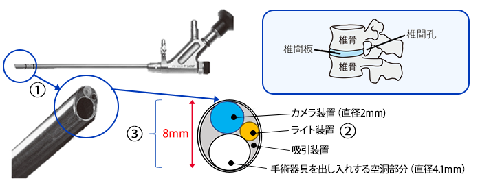 の3つ機能を備え、丸い空部分から手術器具を出し入れする先端部分を椎間孔から椎弓内に入れてヘルニアを切除