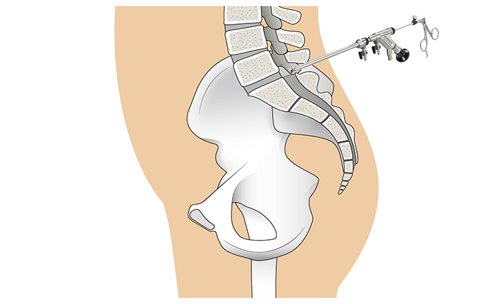 背中の真後ろから内視鏡を入れて、ヘルニアを摘出する方法です。手術時間は40~60分。
