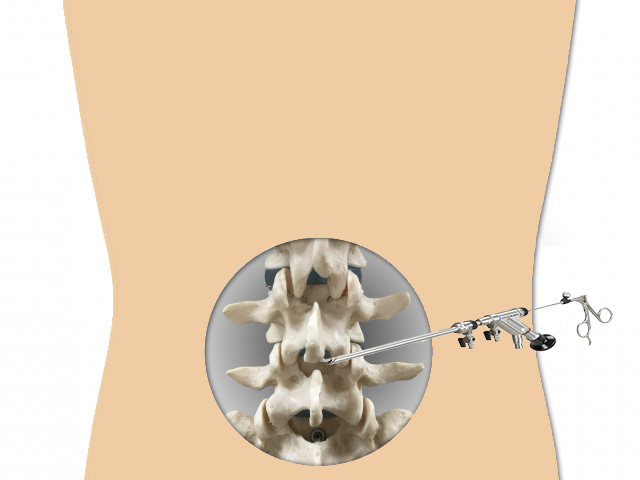背中の横から内視鏡を入れて、ヘルニアを摘出する方法です。手術時間は約30-40分。