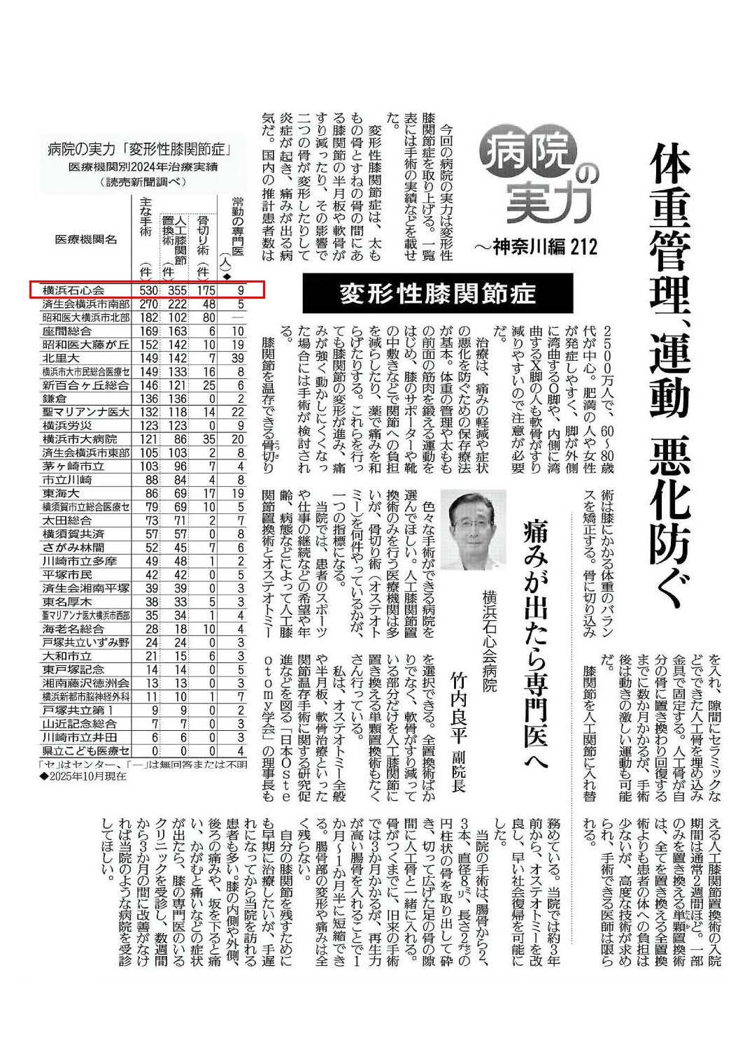 2026年1月25日付の読売新聞(神奈川版)にて、当院の変形性膝関節症の治療実績が掲載されました。 記事内では、当院が県内最多の手術数(変形性膝関節症)を誇る病院として評価されています。また、竹内副院長が変形性膝関節症の治療について詳しく解説しています。